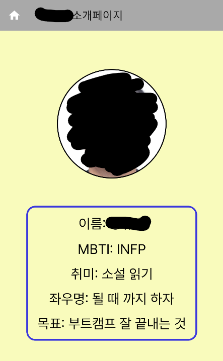 android:text="이름: 이름\nMBTI: INFP\n취미: 소설 읽기\n좌우명: 될 때 까지 하자\n목표: 부트캠프 잘 끝내는 것"
