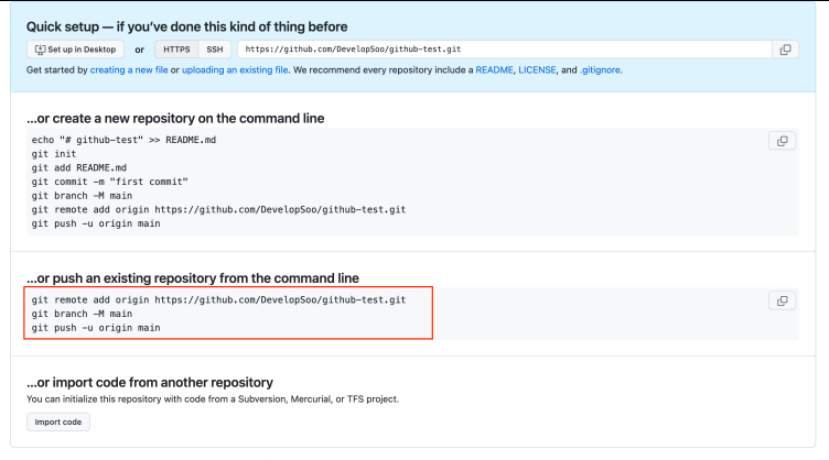 -업로드한 폴더의 터미널을 열어 새로생긴 repository페이지의 붉은 박스내 코드 입력