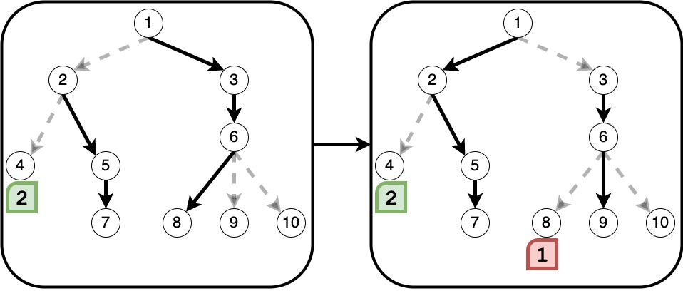3. 숫자가 리프 노드에 도착하면, 숫자가 지나간 각 노드는 현재 길로 연결된 자식 노드 다음으로 번호가 큰 자식 노드를 가리키는 간선을 새로운 길로 설정하고 기존의 길은 끊습니다.