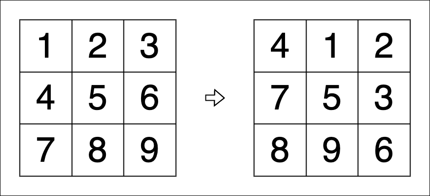 - 왼쪽 행렬이 초기 상태이고 오른쪽 행렬이 Rotate를 한 번 시행한 뒤의 행렬입니다.
