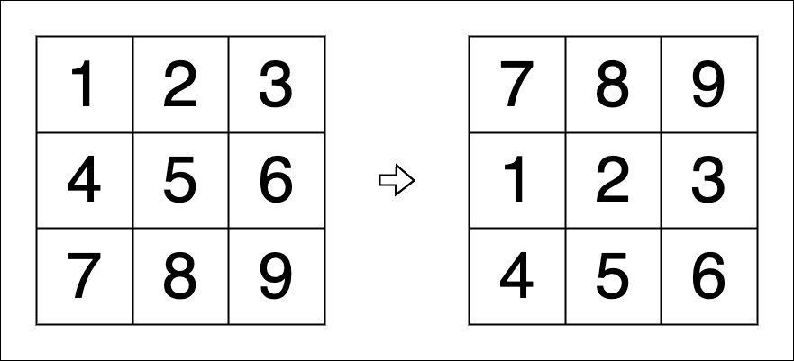 - 1번째 행에 있던 [1,2,3]이 2번째 행으로, 2번째 행에 있던 [4,5,6]이 3번째 행으로, 3번째 행에 있던 [7,8,9]가 1번째 행이 된 것을 확인할 수 있습니다.