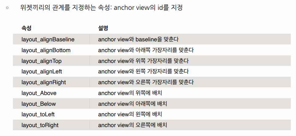 -속성값: 자식 위젯끼리는 뷰의 아이디, 부모 뷰와는 true, false