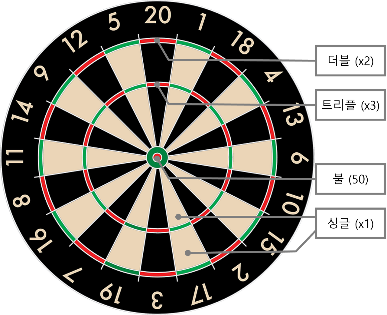다트 과녁에는 1 부터 20 까지의 수가 하나씩 있고 각 수마다 "싱글", "더블", "트리플" 칸이 있습니다. "싱글"을 맞히면 해당 수만큼 점수를 얻고 "더블"을 맞히면 해당 수의 두 배만큼 점수를 얻고 "트리플"을 맞히면 해당 수의 세 배만큼 점수를 얻습니다. 가운데에는 "불"과 "아우터 불"이 있는데 "카운트 다운" 게임에서는 구분 없이 50점을 얻습니다.