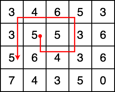 현대모비스에서 전기차로 경사로 주행 테스트를 하려고 합니다. 경사로 테스트는 n×m 크기의 격자 형태의 공간에서 진행되며, 각 칸에 적힌 숫자는 높이를 나타냅니다. 전기차는 격자 내의 모든 칸에서 출발 가능하며, 상하좌우로 인접한 칸으로만 이동 가능하고 격자 밖을 벗어날 수는 없습니다. 전기차가 인접한 칸으로 이동하는 길의 경사는 이동하려는 칸의 높이에서 현재 칸의 높이를 뺀 값입니다. 예를 들어 높이가 5인 칸에서 7인 칸으로 이동하는 길의 경사는 2(= 7 - 5)이고, 높이가 6인 칸에서 높이가 1인 칸으로 이동하는 길의 경사는 -5(= 1 - 6)입니다.