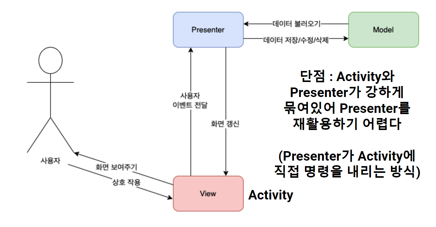 (4)단점: Activity와 presenter가 강하게 묶여있어 presenter재활용이 힘들음(둘 사이 의존성이 높음)
